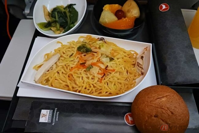 ちなみに、着陸前にサーブされた機内食では、焼きそばをチョイスしました。そしてやっぱり、パンがついてきました。