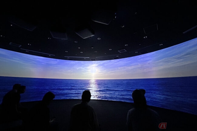 順路の示す通りに進むと、ダイナミックな映像を映し出す180度大型スクリーンと迫力あるサウンドを楽しめる「シアター&多目的エリア」、eBike展示と貸し出し・体験が行われる「PORT(港)」へと続きます。