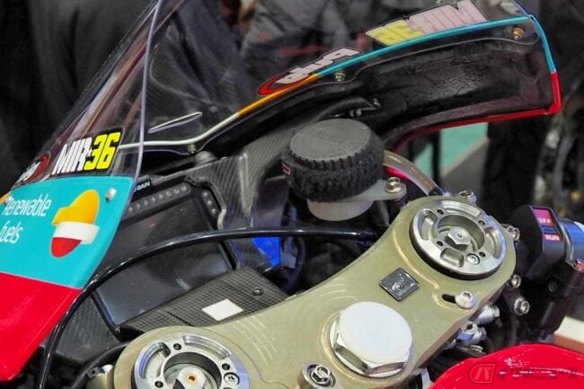 ほんの泡粒のような付着でも、レースの高速走行(MotoGPなら300km/h以上!)で風圧を受けたら、ヌラヌラと広がって視界を妨げる危険があります。本格レースでは視界をクリアに保つためにティアオフシールド(捨てバイザー)を使いますが、それでも万全を期すために、滲んだブレーキフルードが飛散しないように、マスターシリンダーのカップに吸着するためのバンドを巻いているのです。