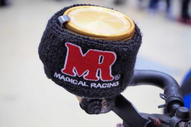 レーシングマシンのフロントブレーキのマスターカップには、なにやらリストバンドのようなモノが巻かれている場合が多いです。一般ライダーのバイクではあまり見られませんが、じつは1980年代半ば頃から爆発的に盛り上がった「レーサーレプリカ」では、皆がこぞって巻いていました。