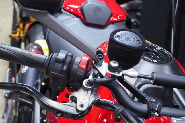 とはいえ一般ライダーは、300km/hもスピードを出さないし、燃料タンクにアゴが着くほど伏せることも無いので、マスターカップにバンドを巻く意味はない……というワケでもありません。前述したようにブルーキフルードは、樹脂パーツや塗装を傷める性質があるからです。