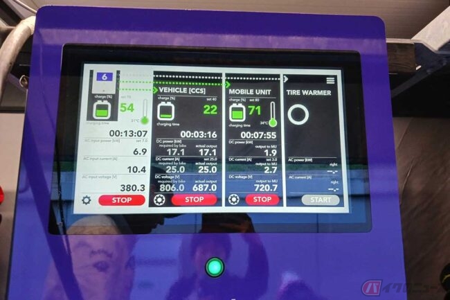 「ポータブル充電器はエネルギー量が少ないので、充電できても1周だけなのです。今回のように、数周分をこのポータブル充電器だけで充電することになると、フルレース分の充電はできません。また、ポータブル充電器では、急速充電もできません。ピットの後ろにある充電器は17kWから20kWで、急速充電ができますが、ポータブル充電器は8kWから10kWで、速さは半分なのです」