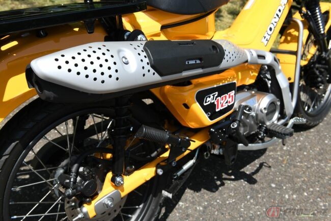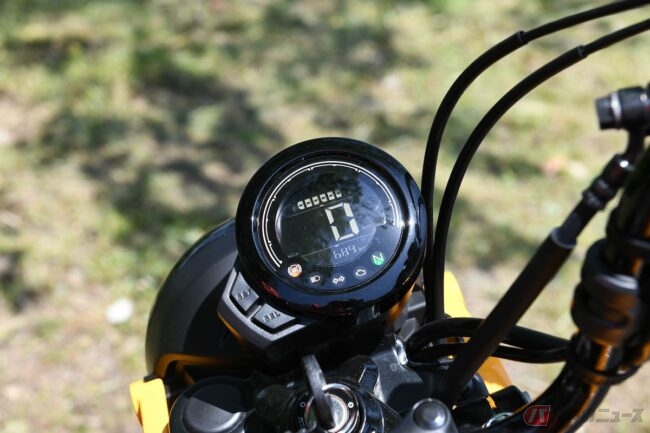 ギュインっと伸びたマフラーは、『スーパーカブ110』や『クロスカブ110』と違って下方面に控えるどころか上に伸び切ることで見る人の目を釘付けにしています。ヘッドライトの突き出した丸い形や、四角いウィンカー、フレームのゴツゴツ感など、全体的にたくましいですよね。メーターもデジタルの液晶メーターなので、走行中の一瞬の確認にも対応しやすいですし、見た目にもより格好良さが増しています。