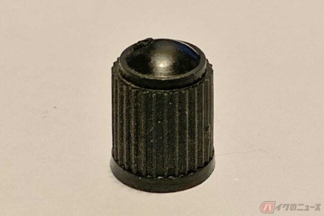 純正パーツはシンプルな樹脂製が多いですが、内側はバルブコアが緩みにくく空気が漏れにくい形状になっており、じつはかなり大切なパーツです。たまにキャップが付いていないバイクを見かけますが、必ず装着するようにしましょう。