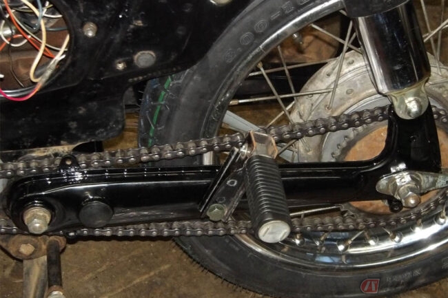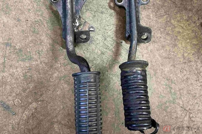 ベンリイC92のメインステップはエンジン下のマウント部から垂直に上がった位置にありますが、ホンダ「ベンリイ CB125K2」では斜め後方に立ち上がっており、高さはそのままに4cm後退した位置となっています。