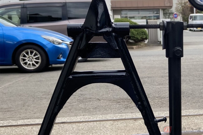 これでマフラーの角度を尻上がりにできるようになったのですが、ノーマルマフラーはサイドスタンドとセンタースタンドそれぞれを収納した際のストッパー的役目を担っており、これがなくなるとスタンドがチェーンケースに当たる所まで跳ね上がってしまいます。