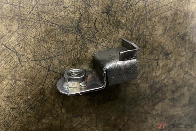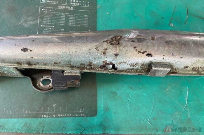 以前のオーナーが乗らなくなった後も、実働状態を維持する目的で定期的にエンジンを掛けていた事が裏目に出て、内部からの腐食が進み、穴が開いてしまったノーマルマフラー。
