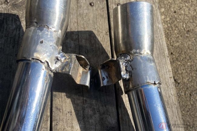 取り付けステーは前側をエキパイ後端のアダプター部に、後ろ側はサイレンサーにそれぞれ現物合わせで製作し、溶接固定することで完成。
