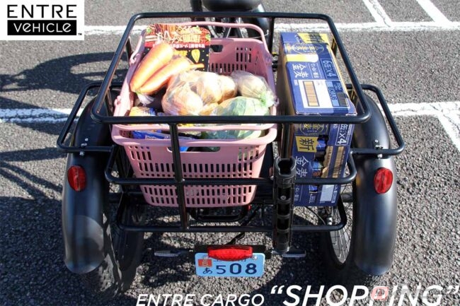 Entre Cargoは高い積載能力(最大90㎏積載可能)と、3輪のファットタイヤによる安定性、フル電動で楽々移動できる、走行性と積載性を両立させた、新感覚のフル電動3輪ビークルで、第一種原動機付自転車(ミニカー)に区分されるため、運転には普通免許が必要になります。
