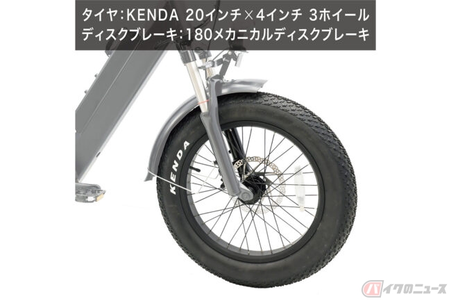 また、信号待ちなどでも自立したまま停車可能で、20インチのファットタイヤを採用し、フロントサスペンションも搭載されているため、悪路でも気兼ねなく走行できます。