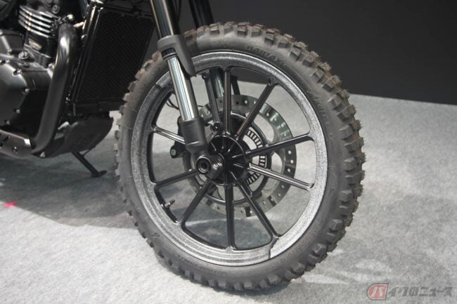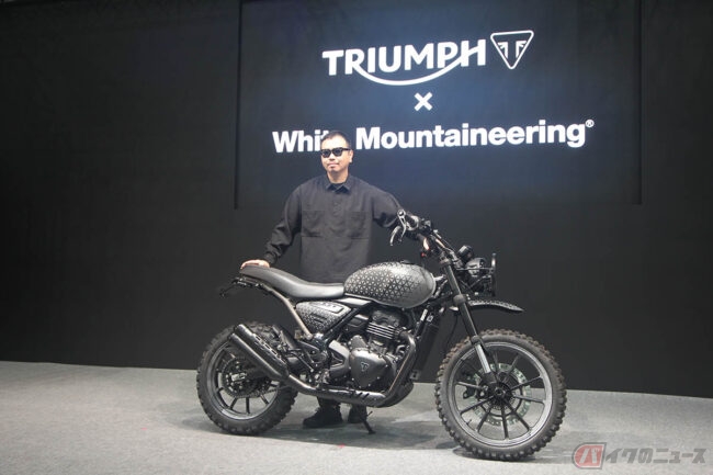 トライアンフが培ってきた伝統的なデザイン、Scrambler 400 Xが持つ軽快なスピード感や乗り心地といった性能、White Mountaineeringの世界観という3つの要素をかけ合わせた同コラボモデルでは、全体を黒基調にするとともに、White Mountaineeringの頭文字である「WM」の意匠をかたどったグラフィックやワンオフシート、ヘッドライトガード、ブロックホイールなどを採用。
