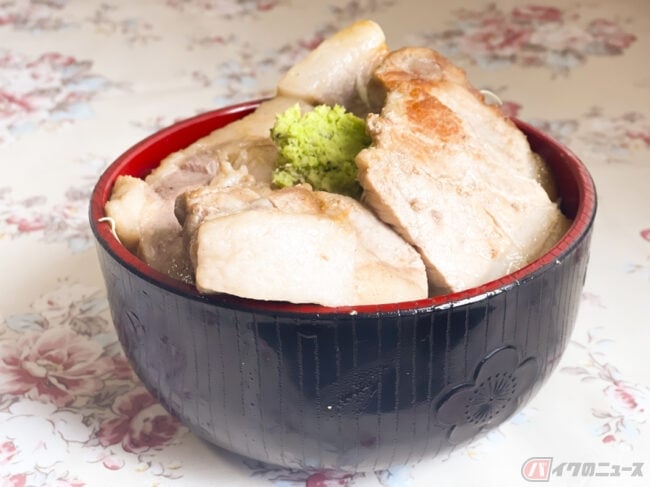 こちらの名物は豚ロース丼。1cmくらい厚みがありそうな豚ロースをソテーしたものが御飯の上にのっているのですが、なんとこのロースが2枚のっているんです。少食の人達は食べきれないくらいのボリュームになります。