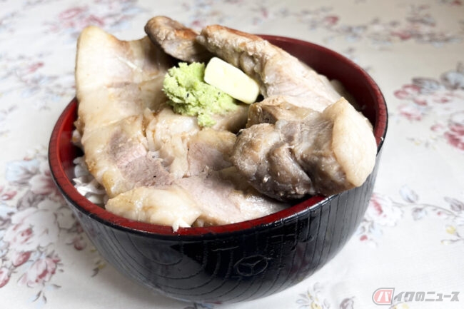 バターが溶け出して醤油味のタレと混ざり合い、ご飯に染み出していきまして、これを豚ロースと一緒にかき込む感じ。