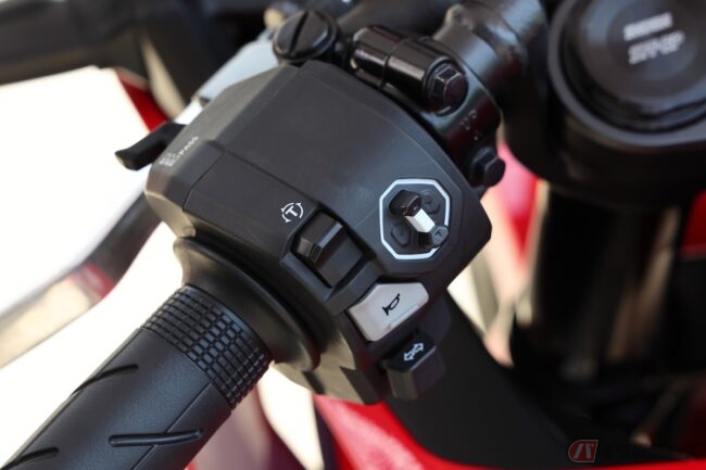 Bluetoothでスマートフォンと連携ができ、音楽などの操作もできるそうです。左手ハンドルにある十字のスイッチで操作ができ、あまり見たことがないボコボコ感のスイッチが意外と上下左右グローブ越しでも触りやすかったです。