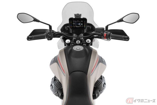 フロント部分はこれまでと同様に、モト・グッツィのイーグルのシルエットを描くDRL(デイタイムランニングライト)を備えた丸形のダブルLEDヘッドライトが装着されていますが、ヘッドランプユニットとインストルメントパネルを固定するブラケットは、これまでのスチールパイプによるトレリス形状から、アルミニウム製ダイキャスト成形の洗練された物に変更され、さらにスポーティでダイナミックな存在感を与えています。