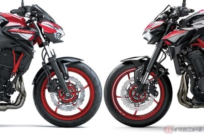 そしてカワサキは、カウリング装備のスポーツモデル「Ninja」シリーズもネイキッドの「Z」シリーズも、4気筒エンジン車は倒立式フロントフォーク、2気筒エンジン車は正立式です。