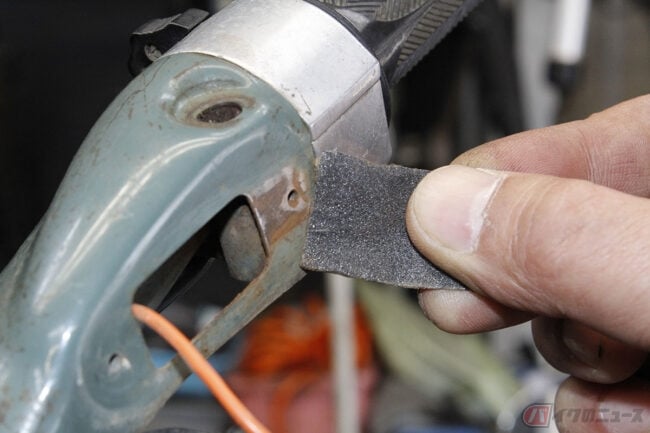 そこで、ウインカーボディとハンドルを締め付ける接点部分をサンドペーパーで磨いて復元確認すると、何事も無かったかのようにウインカーが点滅し始めました。ランプソケットのボディアースが、サビで接触不良を起こしていたのが原因でした。