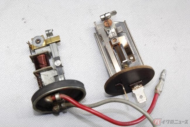 予想できる原因は、スイッチ側ではなく、ウインカーリレー内だと思います。いわゆる旧式ウインカーリレーなので、アルミ筒のカバーを抜いて確認してみましたが、構造がよくわかりません。リレーの接点(ポイント)をわずかに広げて汚れが無いか確認しつつ、800番の耐水ペーパーで接点を軽く磨きましたが作動しません。