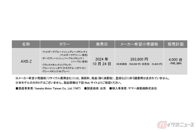 ヤマハは、「AXIS Z(アクシス ゼット)」のカラーバリエーションを変更した新型モデルを2024年10月24日に発売します。