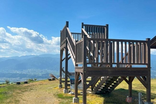 山頂にはトイレと駐車場が完備され、絶景テラスと展望台も備わっています。目の前には中央アルプスの圧巻の景色が広がり、南駒ヶ岳や空木岳の主峰が翼を広げるかのように連なっています。南には、飯田市民に愛される風越山や、中央アルプス最南端の名峰、恵那山の姿も。どこを見ても、息を呑むような絶景が広がっています。