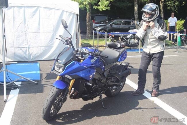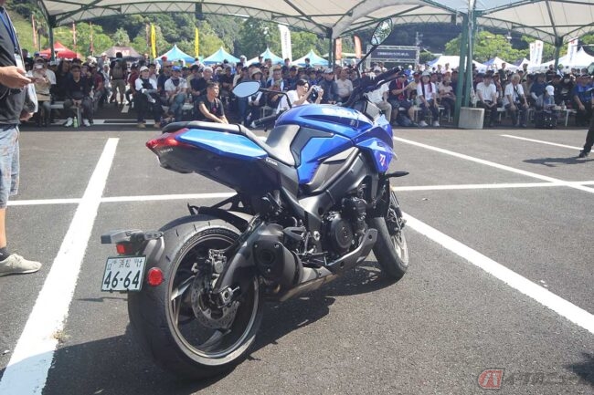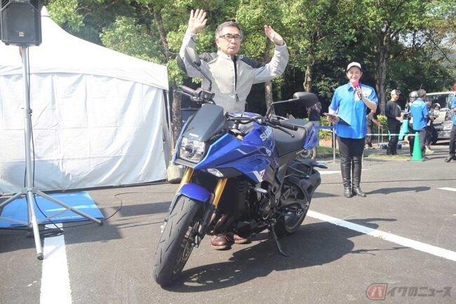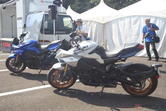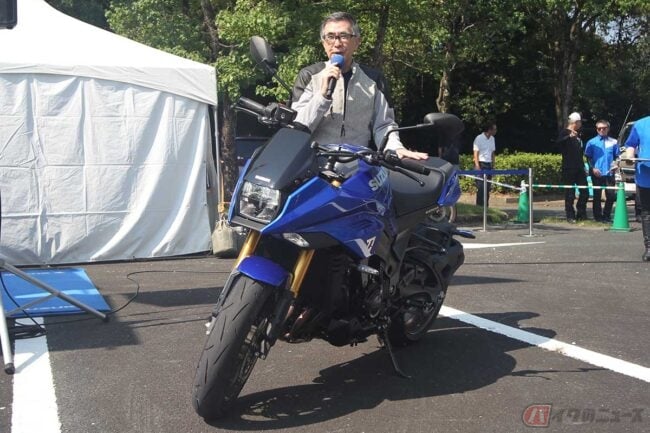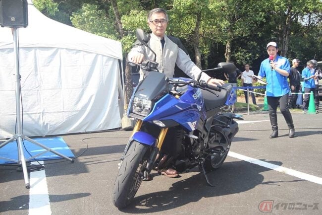 「首都高の青い鳥」仕様!? スズキ「KATANA」国内初公開の新型モデルに乗った鈴木俊宏社⻑が「KATANAミーティング2024」にライドイン