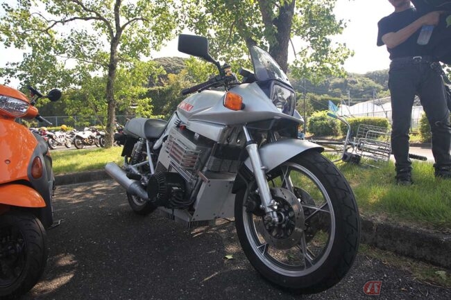 登壇時には開口一番に「皆さんおはようございます! おかえりなさい!」と来場者に話かけ、「台風の影響は大丈夫でしたか? 今日乗ってきたのは本邦初公開の車輌は、カタナミーティングに来てくださる皆さんに国内で一番最初に見せたいということで乗ってきました。新色のKTANAをじっくり見て頂ければと思います」と続けました。