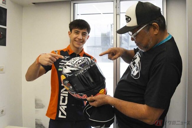 そんな話をしている最中、ちょうどライダーがやってきました。Moto3ライダー、ルエーダ・ホセ・アントニオ選手(レッドブルKTMアジョ)です。ヘルメットについて少し長谷川さんと話をしてから、トレーラーを出ていきました。このようなやりとりが、レースウイークに繰り返されているのでしょう。