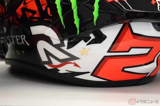 本人のヘルメットの方が量産品よりも少しだけ重い、という事実には驚きです。また、クアルタラロ選手がMotoGPで使用するヘルメットには、左後方に「チャンピオン」の星マークがひとつ、入っているそうです。