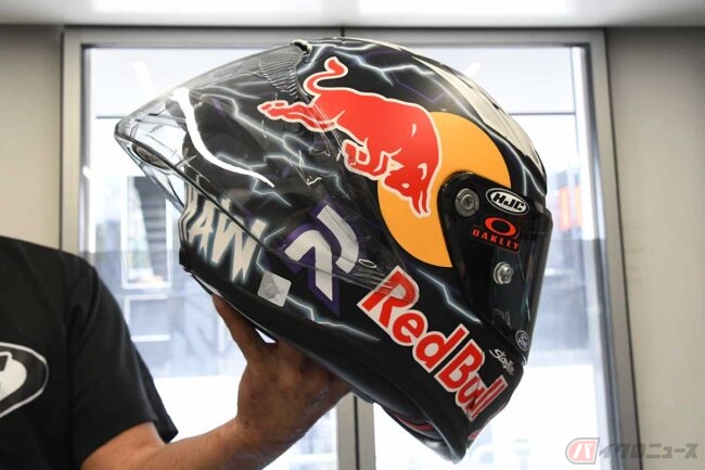 「本人のヘルメットは、ペイント屋さんがステッカーを貼ってクリアをふいたりします。つまり、(ペイントは)ハンドメイドです。量産品は転写で構成されています。だから厳密に言うと、量産品の方が軽いんですよ。ペイントをすると、一色塗るごとに何グラム、何十グラムが増えていくので。量産品のほうは、これだけ色を使っていても、シートに印刷しているだけなので、軽いんですね。だから、(塗装に関しては)全く同じものを買えるというわけではないけど、ベースのモデルは全く同じです。ブラッド・ビンダーのものも、本人のものは塗り。レプリカは転写を使っています」
