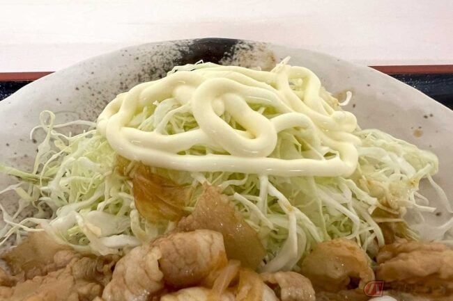 あまり深く考えずに注文したところ、出来上がりを見て想像以上のインパクトに少々驚きました。豚肉とキャベツの千切り、卵黄というスタミナ系メニューによくある組み合わせですが、具材がすべて山盛り状態だったので、嬉しい驚きでした。ご飯も大盛りです。
