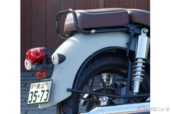 重厚感のあるフロントフォークカバーやヘッドライトカバーなどのフロント部から、タンク、サイドカバー、セパレートタイプのシートへと、リアにかけてなだらかに傾斜したプロポーションとされたGB350Cでは、前後のフェンダーを大型化するとともに水平基調のマフラーを採用することで、ロー&ワイドを強調。