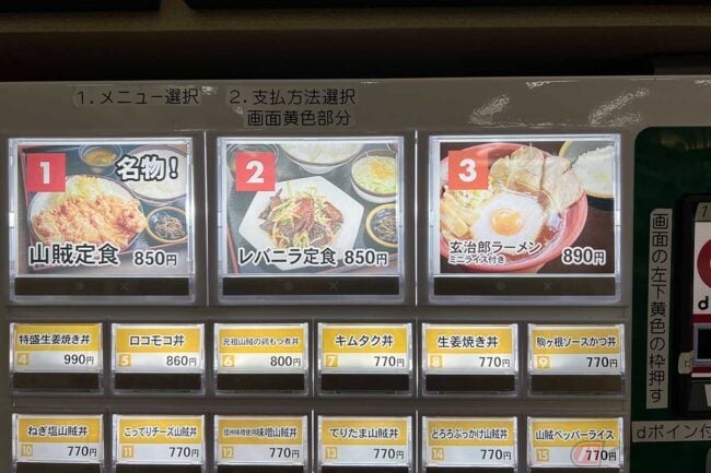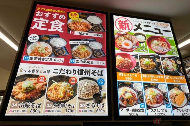 ツーリング中に長野自動車道「みどり湖PA」(上り)に立ち寄り、フードコートの「小木曽屋玄治郎」(営業時間:7時~20時)で食事をしました。ここでは二八蕎麦をはじめ、塩尻名物の「山賊焼き」などのメニューが提供されています。券売機を見ると、新しいメニューが打ち出されていました。新メニューは店のやる気や活気が感じられて、少し嬉しい気分になります。