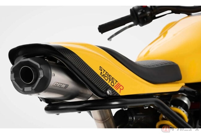 シンプルなトレリスフレームを採用することで車重145kgに抑えられたストリート・モトではファクトリー・ブルー、ヘリテージ・ホワイト、ミッドナイト・ブラックの3色が用意されたベースグレードのほか、シグナル・イエローとリキッド・マーキュリーが用意された「R」グレードもラインナップ。