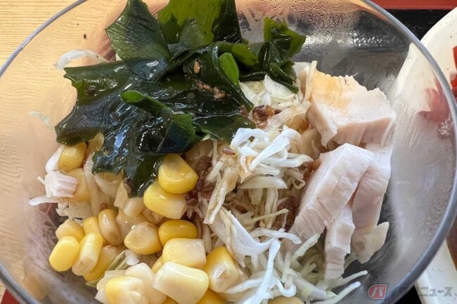 ということで実食。まずはサラダから。わかめをはじめ、鶏のささみ、コーン、キャベツの千切りなどが入っています。やはり肉厚のわかめは食べ応えがあります。わかめを主役として楽しむサラダも良いものです。