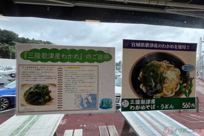 以前食事に訪れた際に知ったのですが、ここでは三陸歌津産のわかめを使用しています。その説明書きは食堂の窓ガラスに貼られており、三陸宮城県の外洋(外湾)の歌津産わかめは、海流が激しい環境で育つため葉肉が厚く、シャキッとした食感があるそうです。また病害虫などの付着も少なく、品質も安定しているとか。そのことを知っていたので、わかめサラダには期待できます。