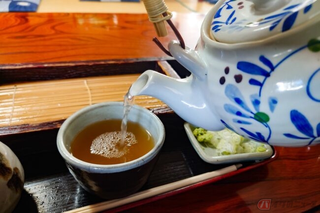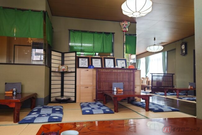お店へ入ってみると、想像以上に広くて奥行きがありました。靴を入り口で脱いで入るスタイルで、テーブルと畳が敷かれている座敷の席が用意されています。バイクに乗っているとずっと同じ姿勢ですし、なんとなく足を伸ばしたかった気分だったので今回は座敷にしました。畳の匂いと落ち着いた照明が田舎の家に遊びに来たような懐かしい気分になります。