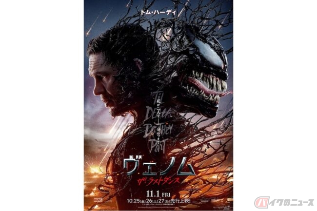 『ヴェノム』シリーズとバイクには切っても切り離せない関係があります。記念すべき1作目『ヴェノム』ではドゥカティ「スクランブラー」でサンフランシスコを爆走するアクションシーンが印象的でしたし、2作目『ヴェノム:レット・ゼア・ビー・カーネイジ』では、宿敵カーネイジを象徴するように真紅の「パニガーレV4S」が登場しました。本作も公開されている予告編で、車種は判別できなかったのですが、巨大なシンビオートに追いかけられるバイクチェイスシーンがチラッと映し出されています。果たして登場するのは本作でもドゥカティなのか? そちらも気になるところです。