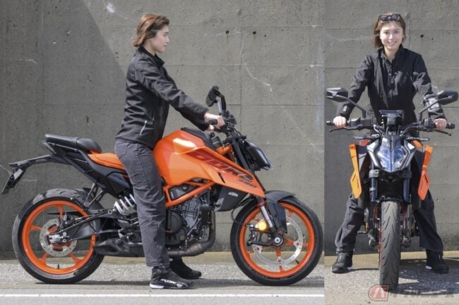 私、正直これまで色々なバイクに乗らせていただいて、足がつかないことは滅多にないんですが、250 DUKEと並べて見てみると「おやおや?大丈夫かしら…」と不安になりましたね。