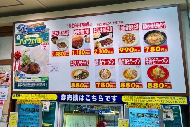 今回は上り線施設にバイクで立ち寄り、24時間営業のフードコートを覗いてみると「菅生のおすすめ品」として数種類のメニュー写真が貼り出されていました。