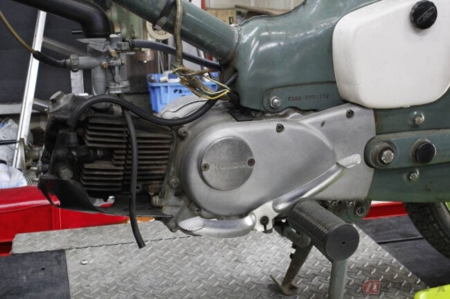 OHVのC100エンジンを「モデナイズ」 (=現代では当たり前の技術を採用)することで、マフラーからの白煙対策ができないものか? オーバーヒート時の、焼けるようなオイル臭さを減らせないものか……。現代では当たり前のようなことですが、OHVエンジン時代のスーパーカブC100にとっては、理想的なお話しでもあります。