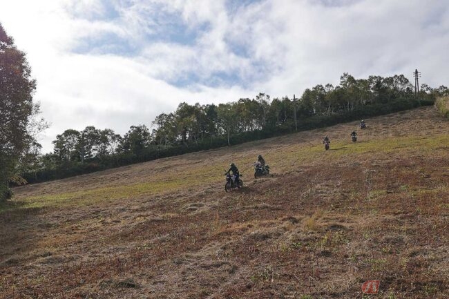 なかでも圧巻だったのは、スキー場内を走る「ゲレンデクルーズ」です。普段のバイクライフではあり得ない未舗装の急坂をよちよち登り、休憩地点で絶景を眺め、とてつもない角度(のように思える)ゲレンデを恐る恐る下って、平地に戻ったときの達成感と充実感と言ったらもう……!!