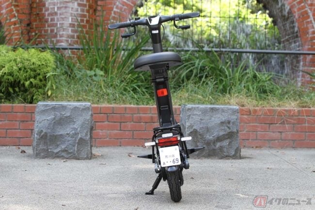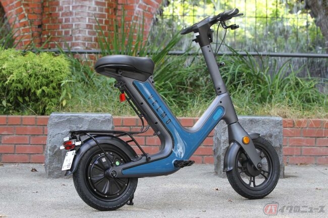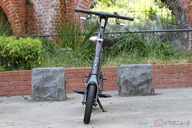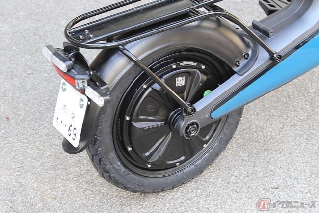 一体成型のフレームとフロントフォークの素材にマグネシウム合金を使用し、前後に14インチのタイヤ、リヤに500Wのインホイールモーター、シート下にバッテリーを搭載しています。