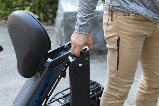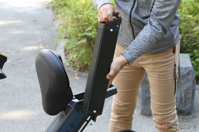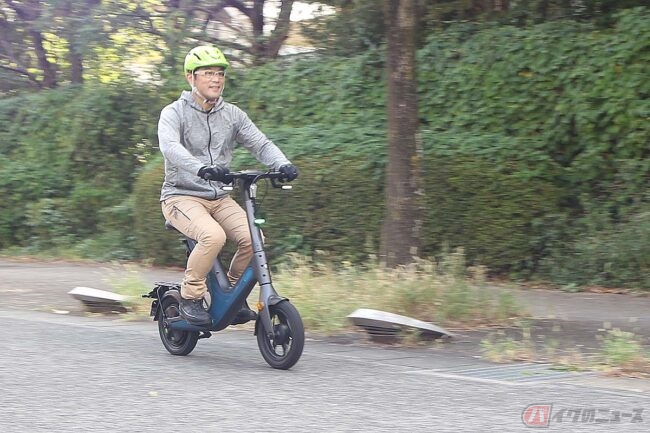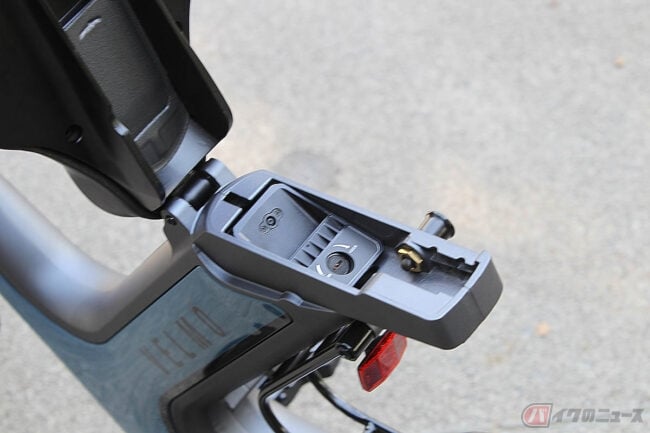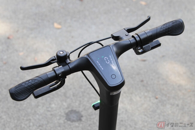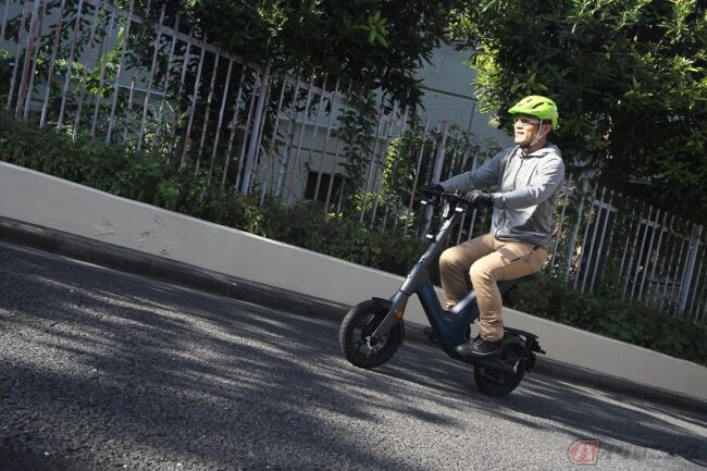 大きなシートで座り心地がとても良く、ハンドルステム部がメーターパネルになっていてNFCカードキーのタッチで起動します。特例特定原付の6km/hと、15km/h(Dモード)、20km/h(Sモード)の3つの走行モードがあり、レバー式アクセルの操作で走ります。
