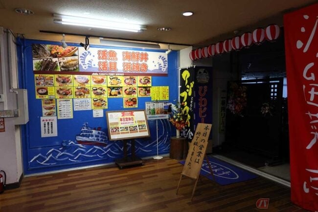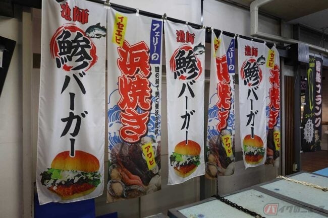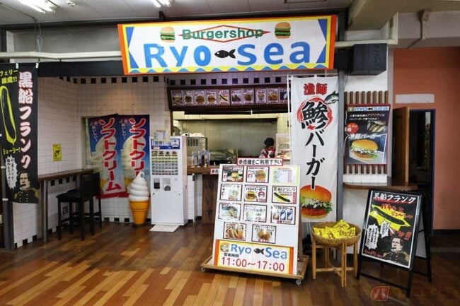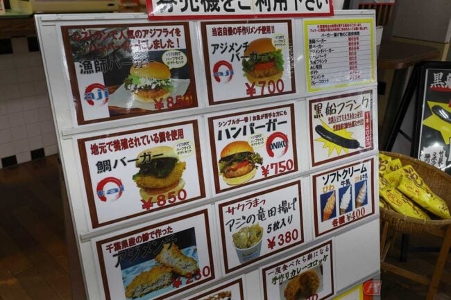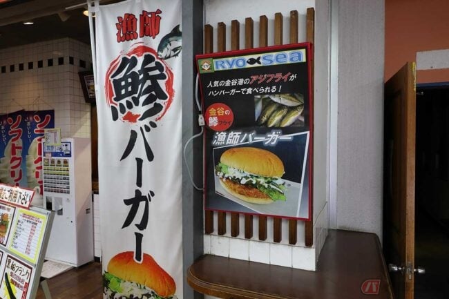 食べられないとなると、余計に食べたくなるもの。ふと反対側を見ると「Burgershop」という文字が見えます。ハンバーガーでお茶を濁すかと近づくと「鯵バーガー」と書かれたノボリが立っています。これはもしや? と「Burgershop Ryo-sea」の前まで行くと、メニューが貼られたボードにアジフライを使った「漁師バーガー」なるものがドーンと輝いています! しかも「レストランで人気のアジフライをハンバーガーにしました!」というコピーが書いてあります。