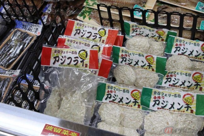 千葉県の特産品やお土産が購入できる「食彩市場」を見ていると、勝浦担々麺や鯨のたれ、マックスコーヒーなど、千葉県ならではのお土産や、東京湾フェリーのグッズも販売しています。そこで目に留まったのが、冷凍の「金谷フェリー名物 アジフライ」です。名物のアジフライと聞いたら食べたくなるではないですか!