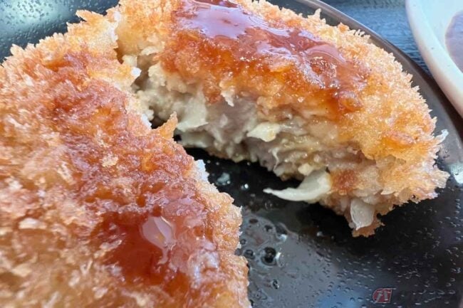 オプションで購入した「はまぽーくメンチカツ」にもソースをかけていただきます。中のメンチは柔らかく、ソフトな食べ応えです。後日調べてみると、「はまぽーく」は横浜で生産され、肉質が柔らかく、脂が白く甘さがあり、あっさりしているブランド豚とのこと。クセもなく、またしつこさもなく食べやすいものでした。