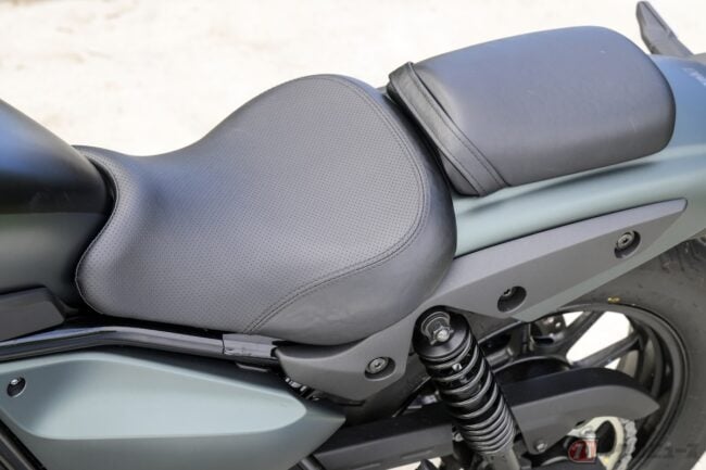 クルーザータイプならではのシート高が低く、ハンドルがシートよりも高い位置。全体的に緩やかな曲線のフォルムに対して、尖りのある黒々としたシックなデザインにギャップを感じます。孤高の存在感溢れる佇まいに魅力を感じました。サイドから見るとスリムなのかなと思いきや、わりとボリュームがある太めの車幅もずっしり感があって迫力もあります。