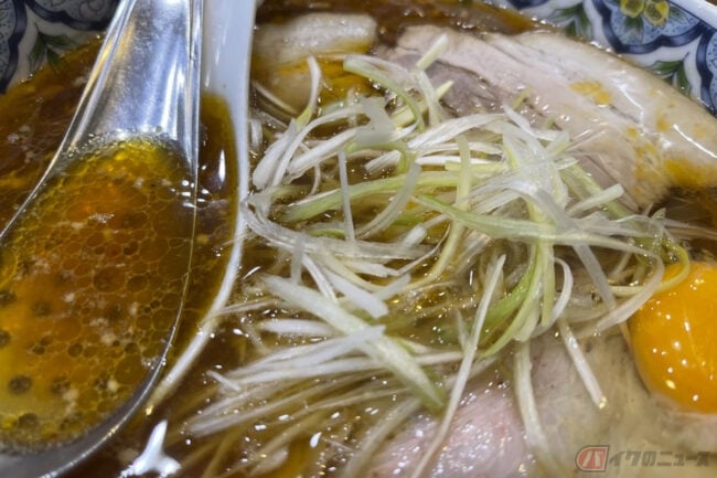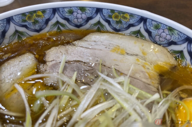 厚めのチャーシューとネギのコントラストが実に美しい。いやー、月見チャーシューにしておいて良かった。