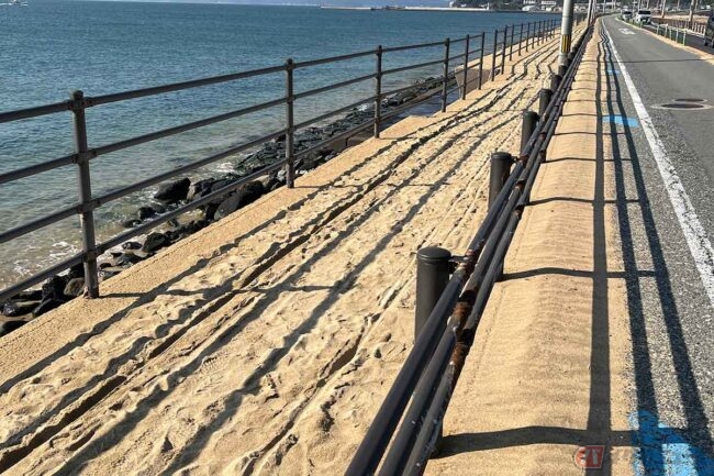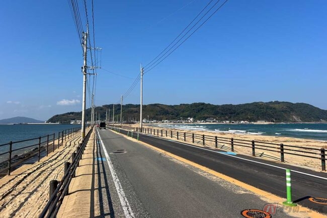 吹き付ける風によって路肩には砂が積もっています。砂州は、現在も刻一刻と形を変えていることがわかります。砂に車輪が取られないよう、十分に注意しましょう。