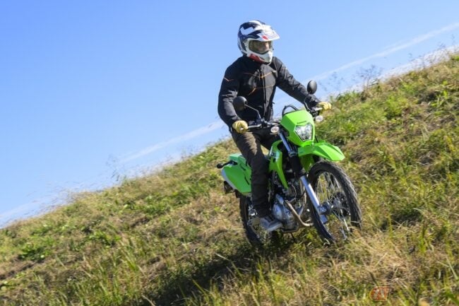 今回はKLX230Sにも乗ることができました。シェルパの車体色がミディアムスモーキーグリーン、ミディアムクラウディグレー、ホワイティッシュベージュといった自然と調和するアースカラーを採用するのに対し、KLX230SはモトクロッサーKXシリーズを彷彿とさせるライムグリーン、そしてバトルグレーの設定。よりアグレッシブな印象です。